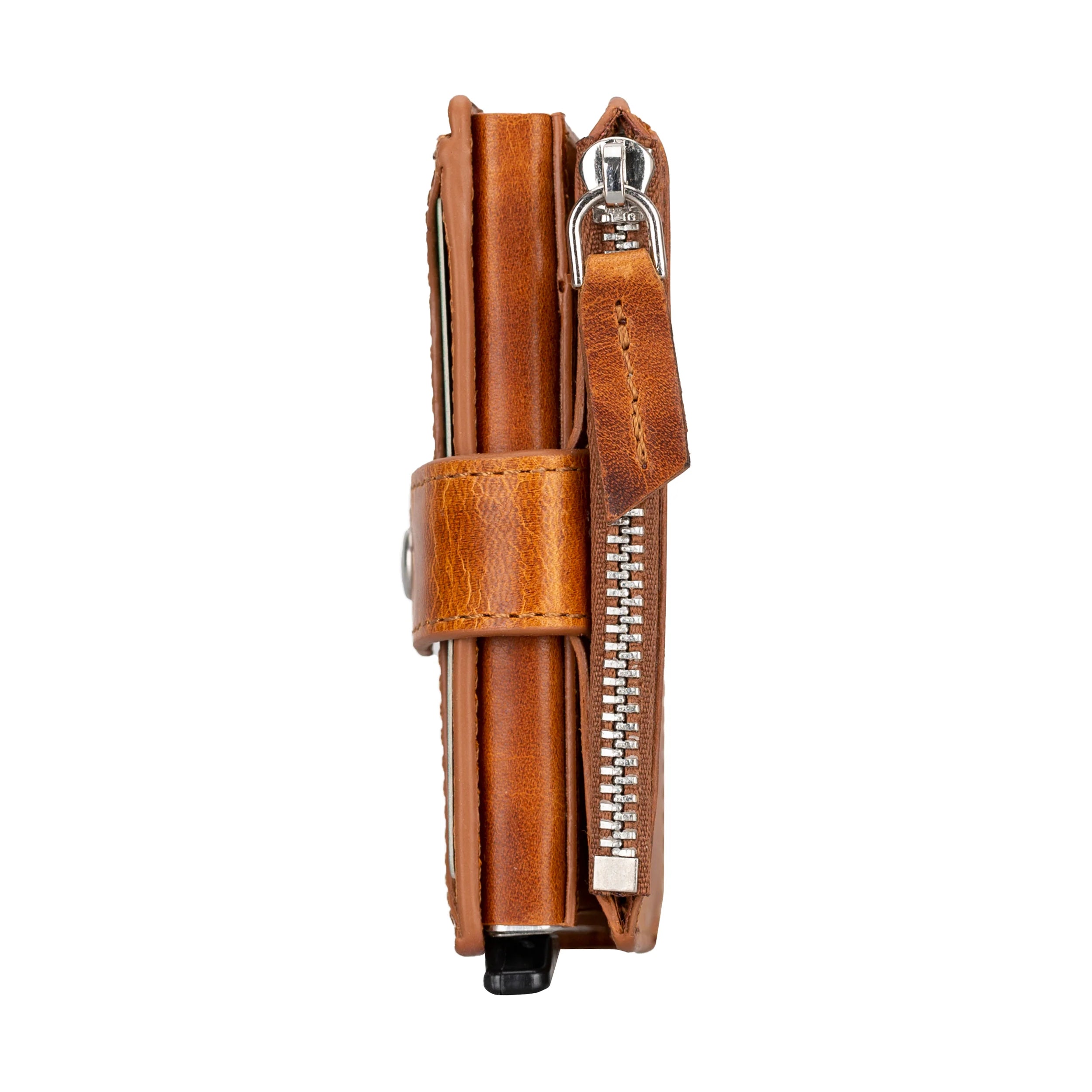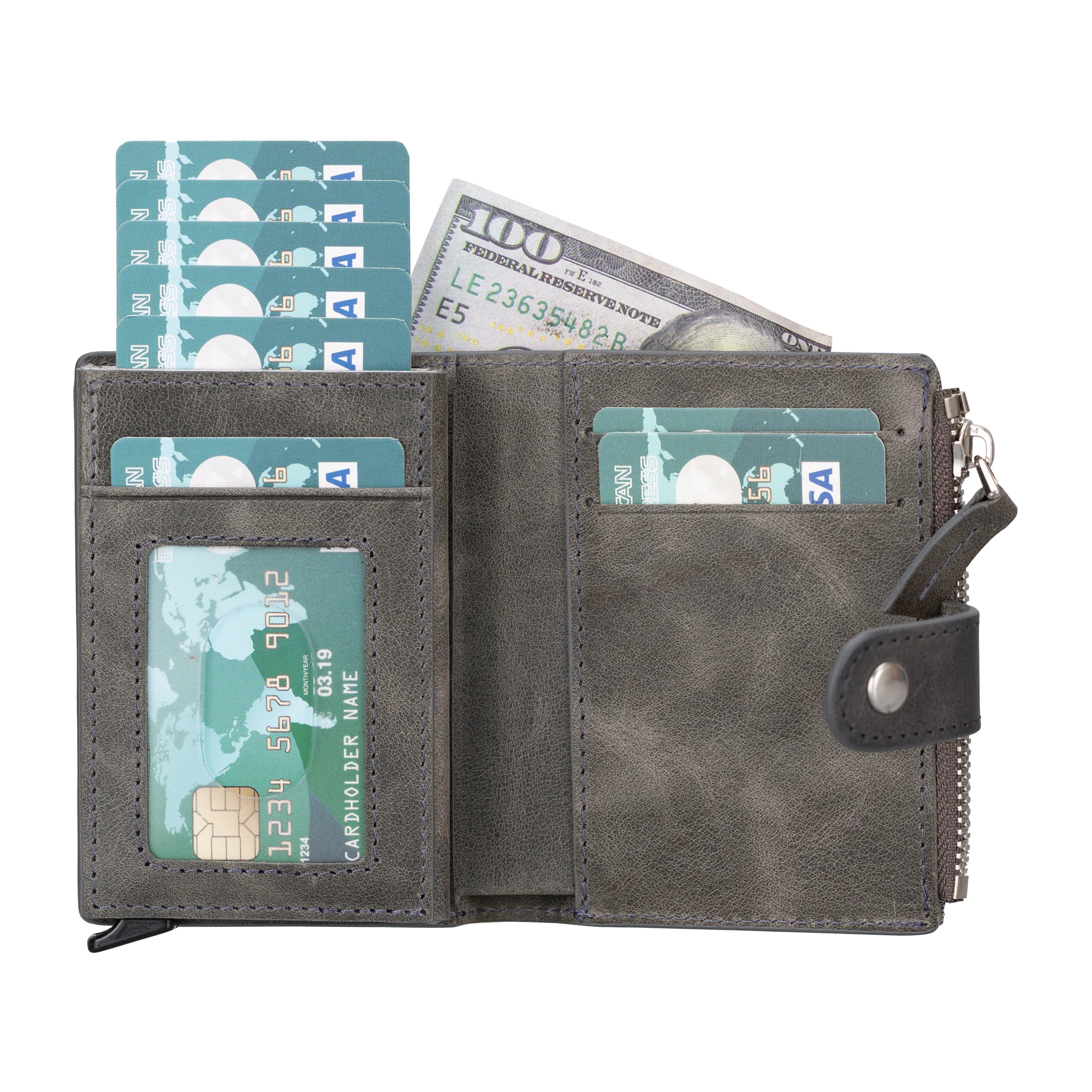 The Annecy Leather Zip Mechanical Card Holder is the quintessential choice for security-conscious professionals who desire a sophisticated blend of modern convenience and premium artisan protection. This handcrafted accessory offers the significant advantage of a quick-access mechanism, allowing you to retrieve up to six cards with a single swipe within a 100% genuine leather frame. It ensures your digital data remains shielded through integrated RFID-blocking technology while providing a remarkably organized profile that includes a clear window slot and a secure zippered compartment.