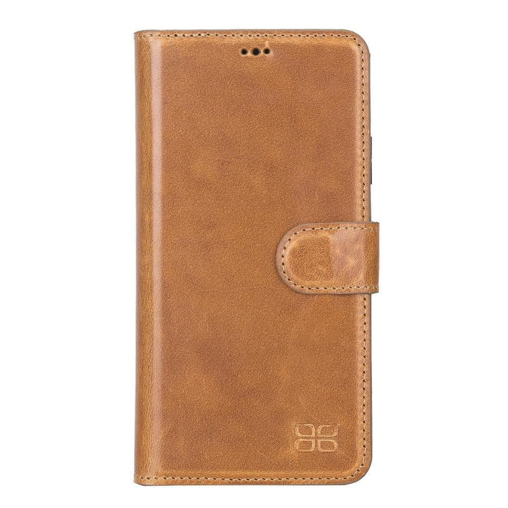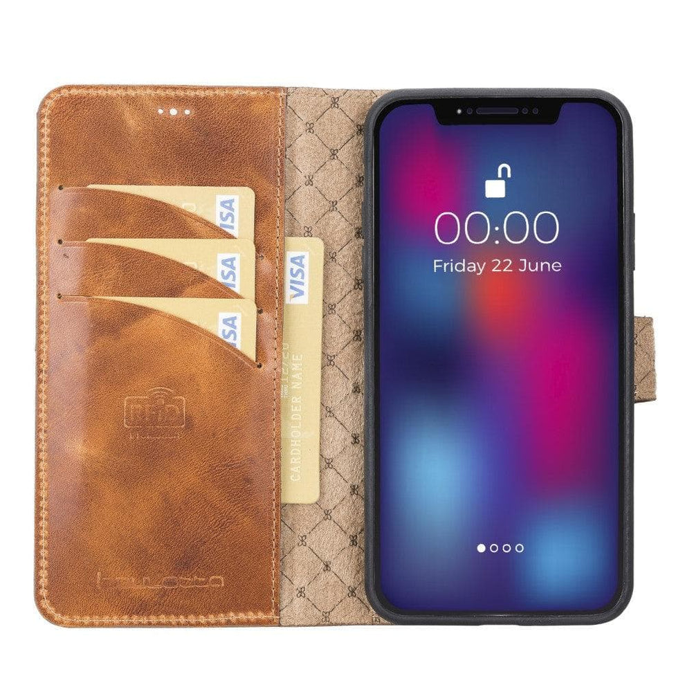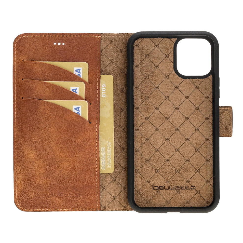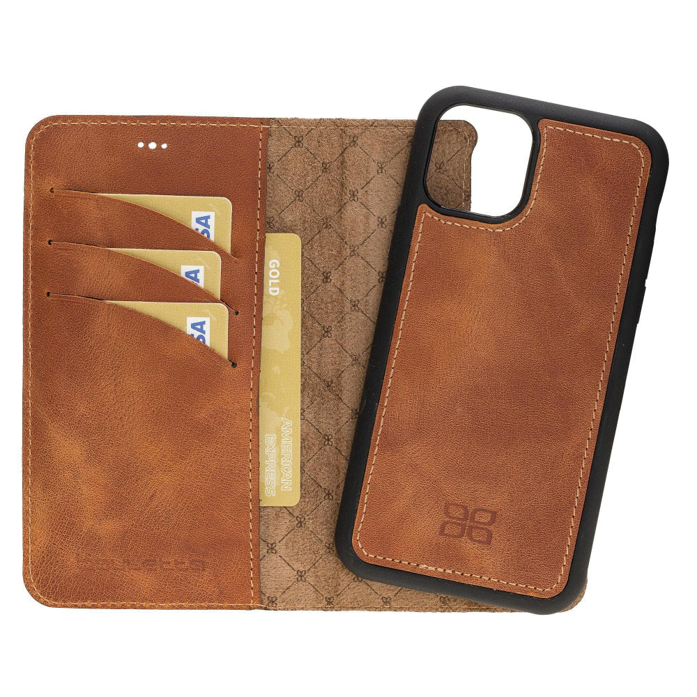 Protect your device with the versatile iPhone 11 Series Leather Wallet Case, featuring a 2-in-1 detachable design made from genuine full-grain leather. This functional cover includes RFID protection, three card slots, and a magnetic suede-lined inner case compatible with magnetic surfaces. Enjoy the convenient kick-stand and high-edge construction, ensuring maximum security and style for your iPhone 11, Pro, or Pro Max.